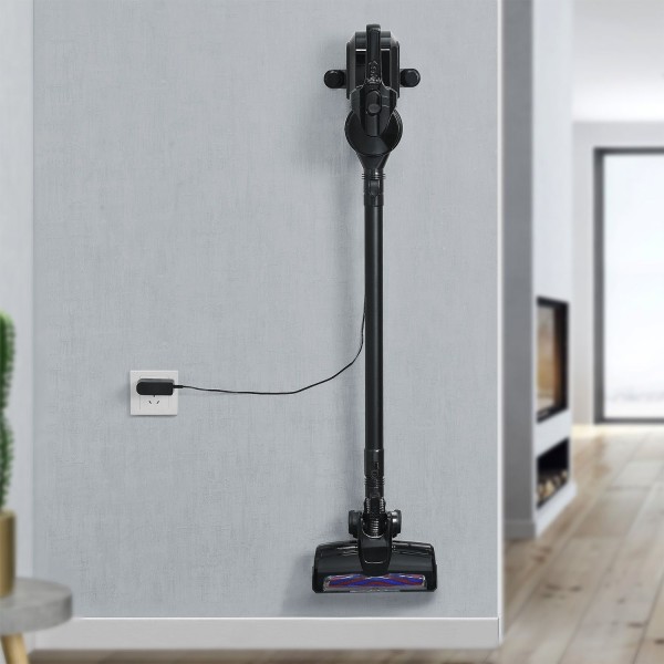 Завдяки настінному кронштейну можна зберігати бездротовий пилосос на стіні, щоб заощадити місце. Вбудована зарядна станція з блоком живлення для звичайних розеток дозволяє одночасно заряджати бездротовий пилосос. Це означає, що пилосос завжди готовий до наступного збирання.