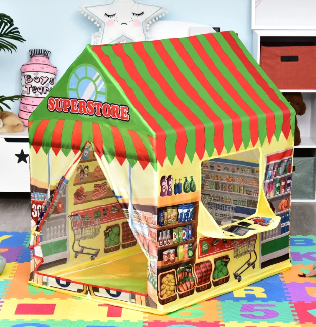 Діти можуть бавитись в наметі імітуючи похід до супермаркету. Цікавий, яскравий та різнокольоровий дизайн. Ваші діти весело проведуть час за читанням, грою та розвагами в цьому безпечному, довговічному та екологічно чистому ігровому наметі. Великі двері та вікно забезпечують оптимальну вентиляцію, і ви завжди можете спостерігати за своїми малюками. Легко та швидко збирається. Здійсніть дитячу мрію та придбайте намет прямо зараз!