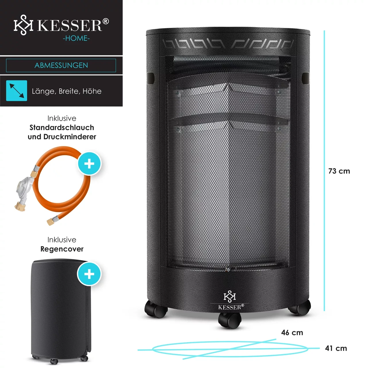 Круглий газовий обігрівач KESSER, елегантний дизайн, два рівні нагріву, природне тепло, повнорозмірна кришка бака, електричне розпалювання, включаючи стандартний шланг і дощовик, а також 3 лотка для транспортування та колеса на 360°