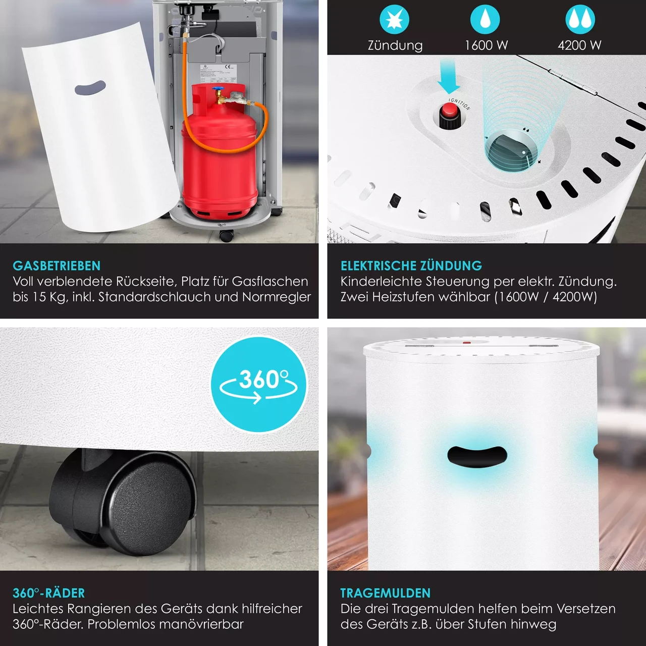 Газовий обігрівач швидко вмикається натисканням кнопки за допомогою електророзпалу, який працює від батарейок типу ААА. Захищене вмикання, щоб діти не могли увімкнути обігрівач. Повністю обшитий панелями радіатор має знімну кришку на задній панелі та практичну заслінку на верхній частині та пропонує місце для газових балонів вагою до 15 кг, які можна під’єднати до стандартного шлангу, що входить у комплект. Два рівні нагріву 1600 Вт і 4200 Вт.
