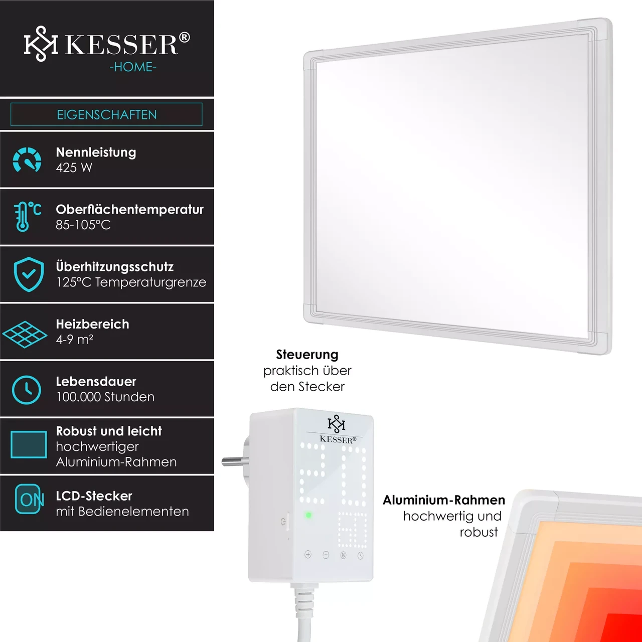 Інфрачервоний обігрівач KESSER. Має клас захисту IP44. Ефективно опалює приміщення та економить електроенергію. Має вбудований захист від бризок, включає термостат, 28 різних програм та функцію виявлення відкритого вікна.