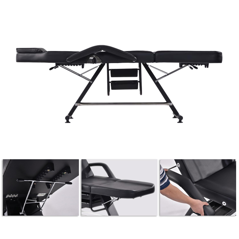 Крісло з отвором у підголівнику, з практичними кюветами, ідеально підходить для косметики, візажу та масажу. Має знімні підлокітники та заглушку у підголовнику. Чохол на сидінні легко миється, виготовлений з еко-шкіри, відповідає суворим вимогам ЄС, естетичний, нікельований металевими елементами.
