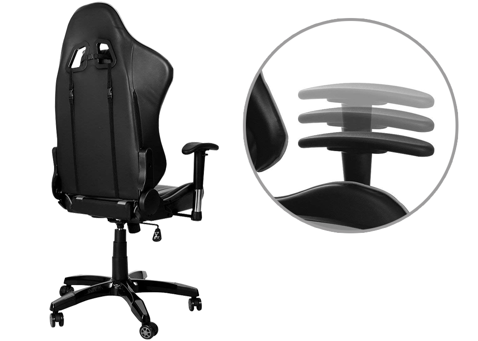 Стілець із міцної синтетичної шкіри (поліуретан) регулюється по висоті та гнучко регулюється кут нахилу спинки. Підлокітники також можуть регулюватися за висотою та кутом.