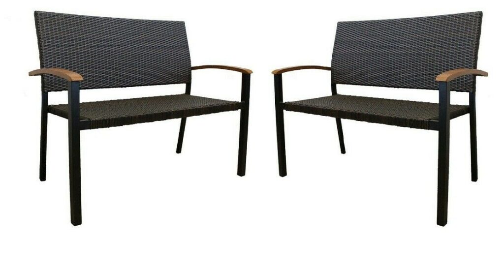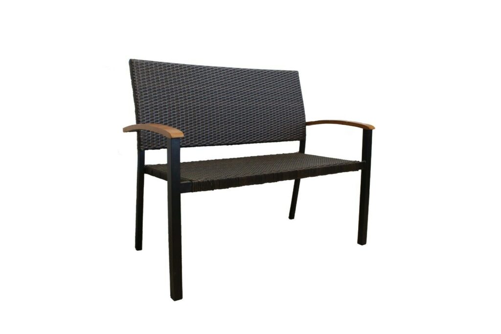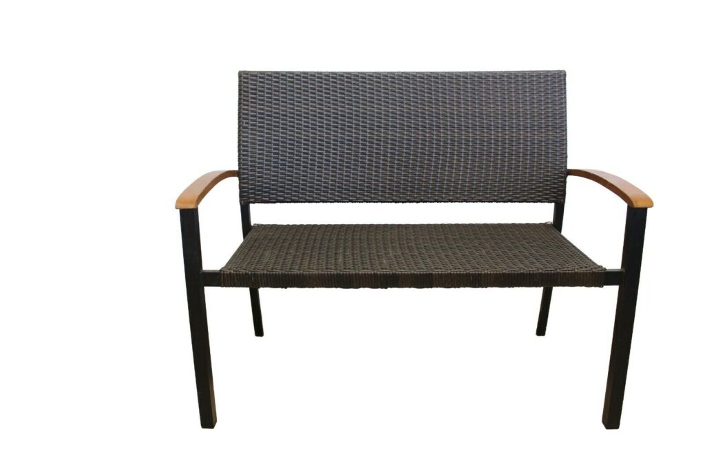 Вона виготовлена ​​зі штучного ротанга – довговічного матеріалу, який стійкий до УФ-променів, перепадів температур і вологості, не деформується при використанні. В основі лавки металевий каркас.