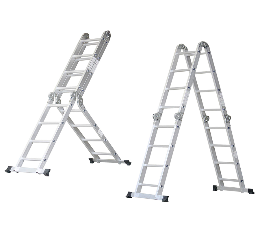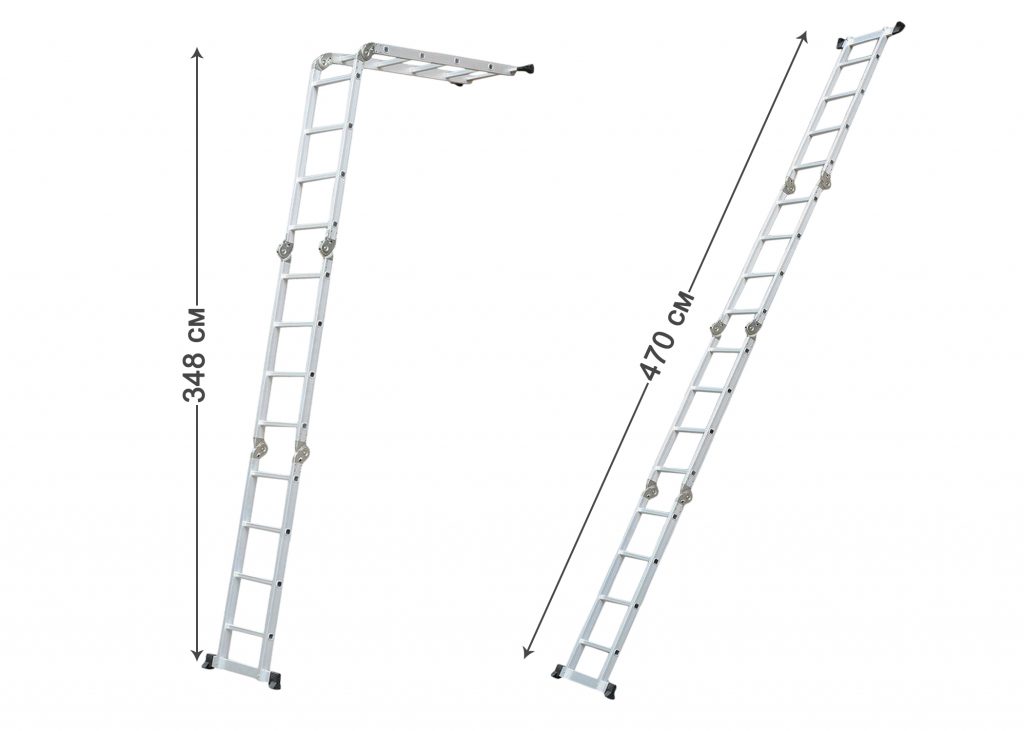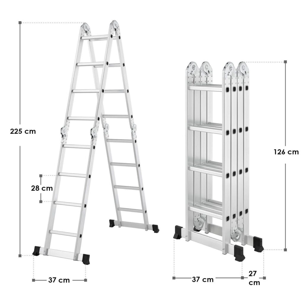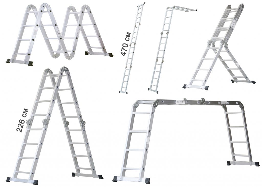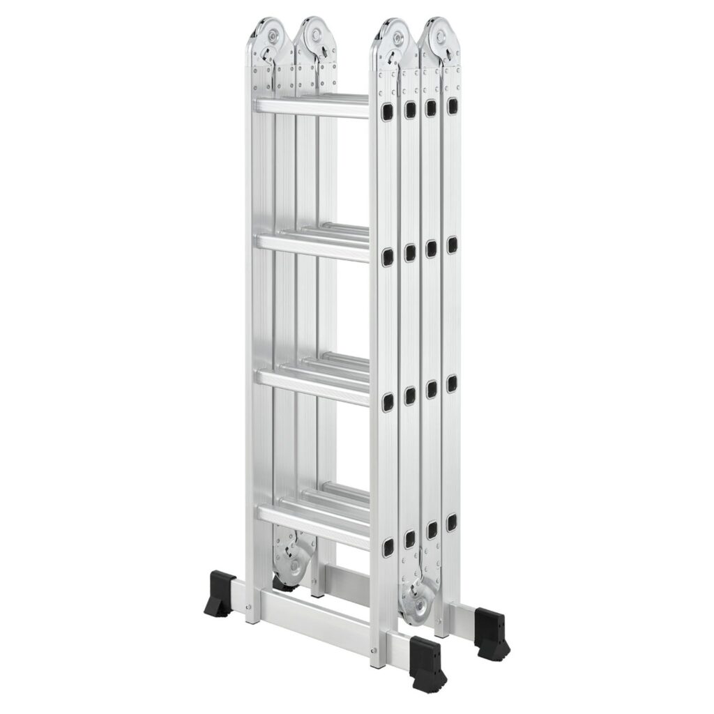 Наші багатоцільові сходи дійсно універсальні. Геніальна шарнірна система з 6 шарнірів поділяє багатоцільові сходи на 4 елементи, кожен з яких має 4 ступені. Ви можете використовувати сходи як косі сходи або подвійні сходи в залежності від ваших потреб. У повністю розкладеному вигляді драбини досягають висоти 4,7 метра.
