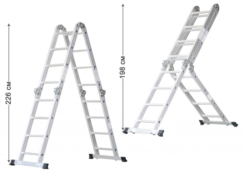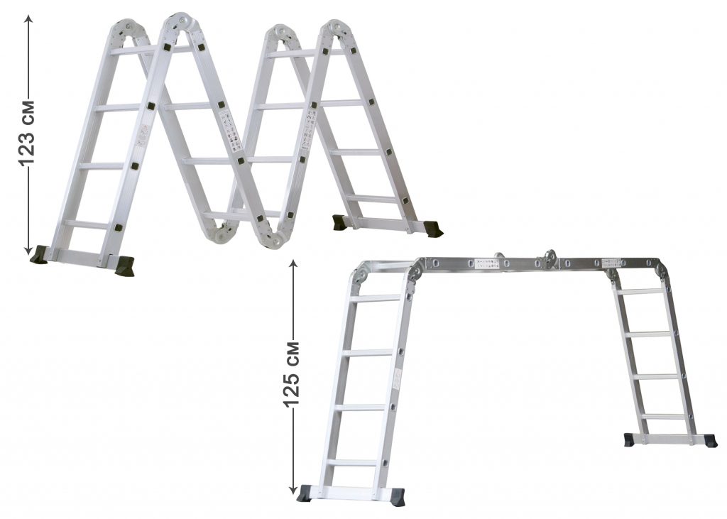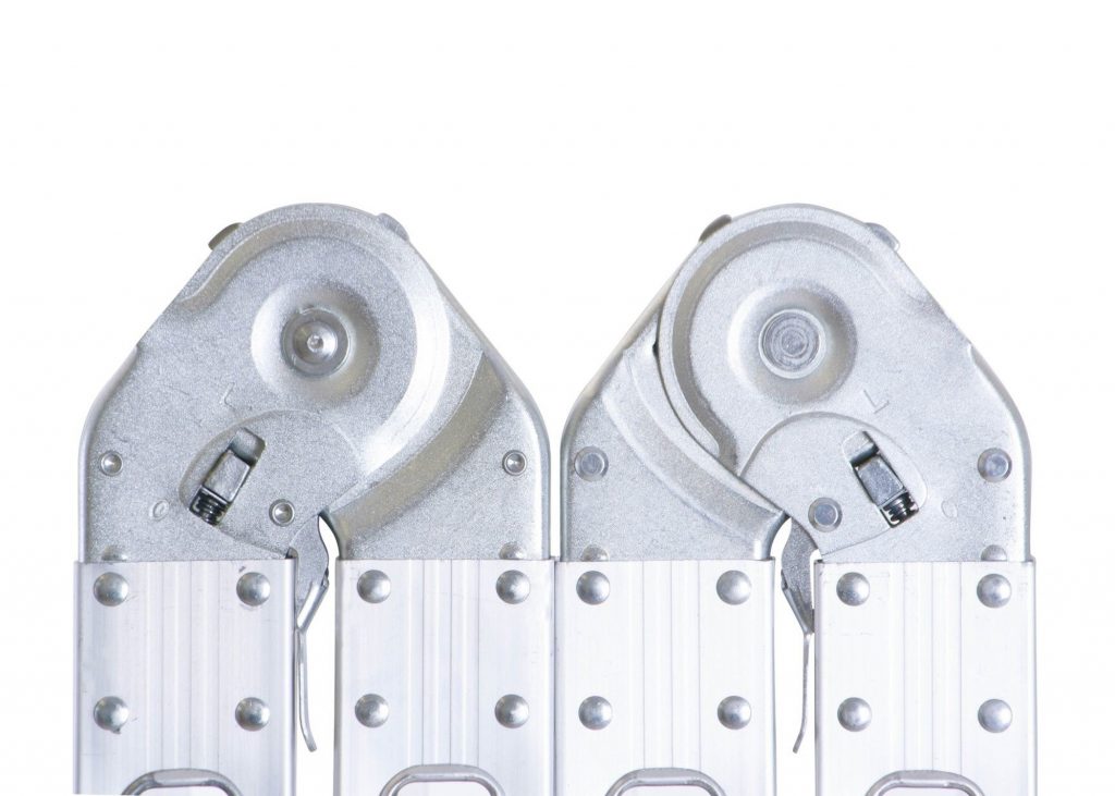Шарнірні драбини витримують вагу до 150 кг. Прогумовані ніжки забезпечують міцну опору. Широкі ступені з протиковзким профілем запобігають ковзанню та забезпечують надійне утримання. Сполучна система із запобіжним замком надає багатофункціональним сходам стійкість.