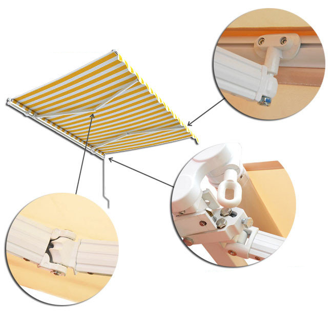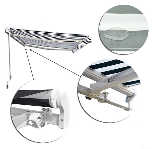 Вигідно прикрасити фасад вашої тераси і одночасно надати їй функціональної користі можна за допомогою такого зручного винаходу, як маркізи. Це естетична та функціональна альтернатива садовим парасолькам. Вони можуть кріпитися прямо на фасад будинку або стелю, і повністю згортаються коли навіс не потрібен. Високоякісне поліестерове покриття стійке до вицвітання і не пропускає вологу, тому під ним можна сховатися від дощу. Воно захистить вас від шкідливого ультрафіолетового випромінювання і сонячних променів, що палять, створить прохолоду в спеку. Тент має алюмінієву раму з порошковим покриттям, що робить її стійкою до несприятливих погодних умов, таких як дощ та інтенсивне сонце та продовжує термін її служби. Нахил тенту регулюється.