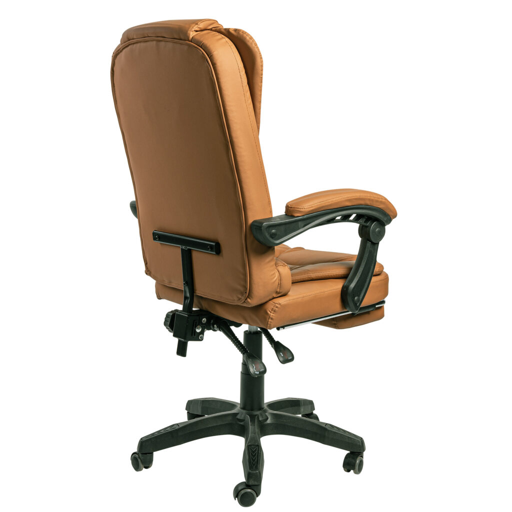 Габарити 69 × 63,5 × 36 мм Гнучке крісло з елегантним дизайном, що імітує шкіру. Це офісне крісло оснащене м’якими гнучкими триточковими підлокітниками. Його можна встановити розслаблююче положення, а підлокітники адаптуються до цього положення. Для максимального розслаблення м’яку підставку для ніг можна вийняти. Крісло, що обертається, можна регулювати по висоті, а так само можна регулювати нахил спинки.