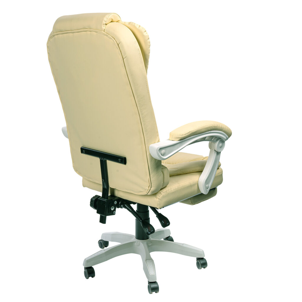 Гнучке крісло з елегантним дизайном, що імітує шкіру. Це офісне крісло оснащене м’якими гнучкими триточковими підлокітниками. Його можна встановити розслаблююче положення, а підлокітники адаптуються до цього положення. Для максимального розслаблення м’яку підставку для ніг можна вийняти. Крісло, що обертається, можна регулювати по висоті, а так само можна регулювати нахил спинки.