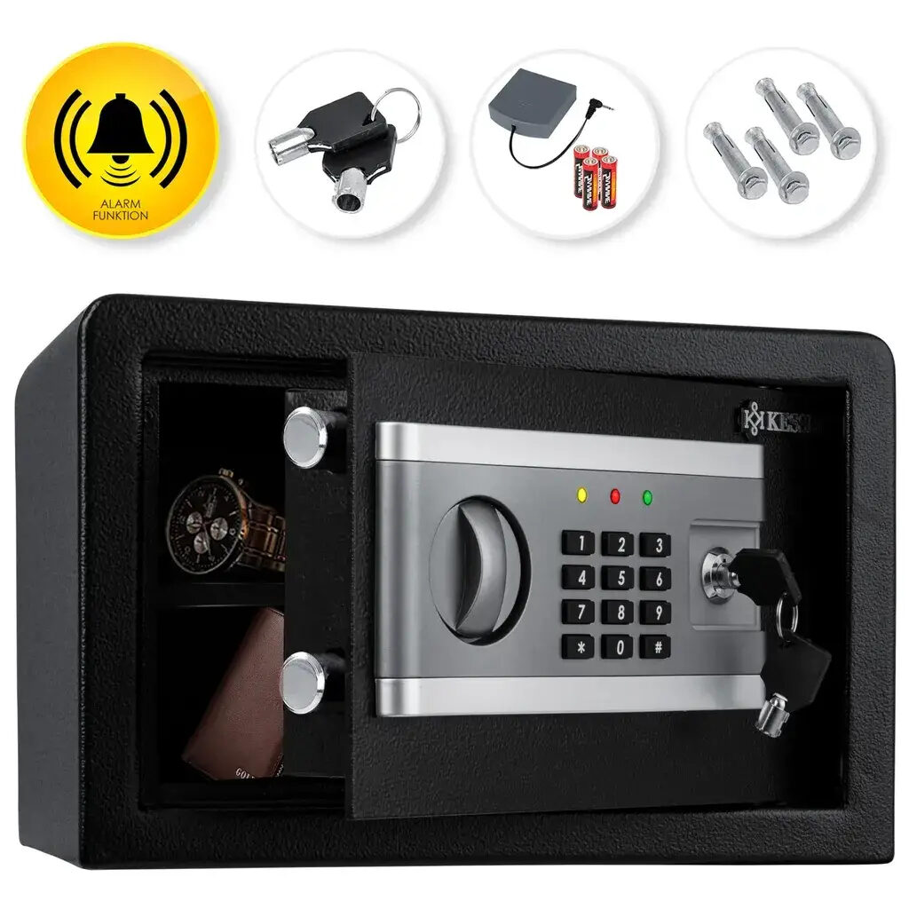 Подвійний електричний замком. Завдяки сталевим дверям товщиною 3,2 мм цей сейф ідеально підходить для особистого користування або в офісі, де можна зберігати цінні речі. Ви можете самостійно встановити код вашого сейфа і за потреби змінити його. Якщо ви забули свій код, є два ключі для екстреного відкриття. Сейф можна закріпити як на стіні, так і на підлозі чи полиці. Подвійний замок із двох сталевих болтів захищає сталеві двері від злому. Світлодіодний індикатор, вбудований у сейф, у будь-який час показує стан заряду батарей, а інший індикатор підтверджує правильність введеного коду.