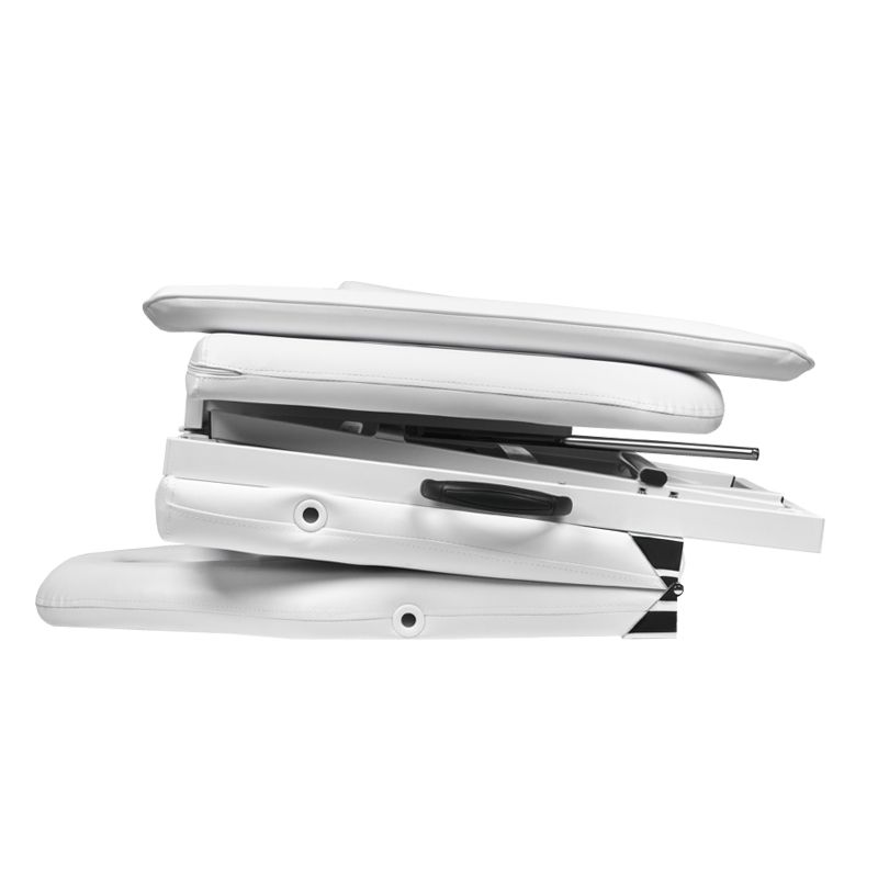 Підстава кушетки — якісна металоконструкція, що складається, пофарбована порошковою фарбою білого кольору. Покриття кушетки зі штучного матеріалу -шкірзам. Товщина пенополіуретанової подушки (10 см) дозволяє Вашому клієнту розташуватися максимально комфортно з будь-якою масою тіла, не відчуваючи жорсткості.