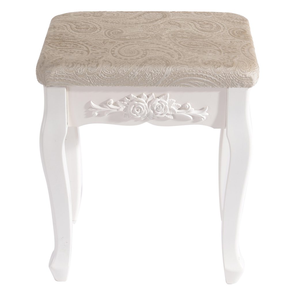 Наш продукт приваблює з погляду дизайну та якості. Першокласний матеріал МДФ та пов’язана з цим довговічна конструкція цього стільця гарантує довгий строк служби. На додаток до свого гарного дизайну, косметичний стілець надзвичайно практичний. Всі елементи виготовлені із МДФ та ручної роботи. Біла обробка надає стільцю сучасний, елегантний та світлий вигляд. Табурет добре обтягнутий і легко чиститься вологою ганчіркою. Цей стілець створює у вашій вітальні романтичну та неповторну атмосферу заміського будинку.