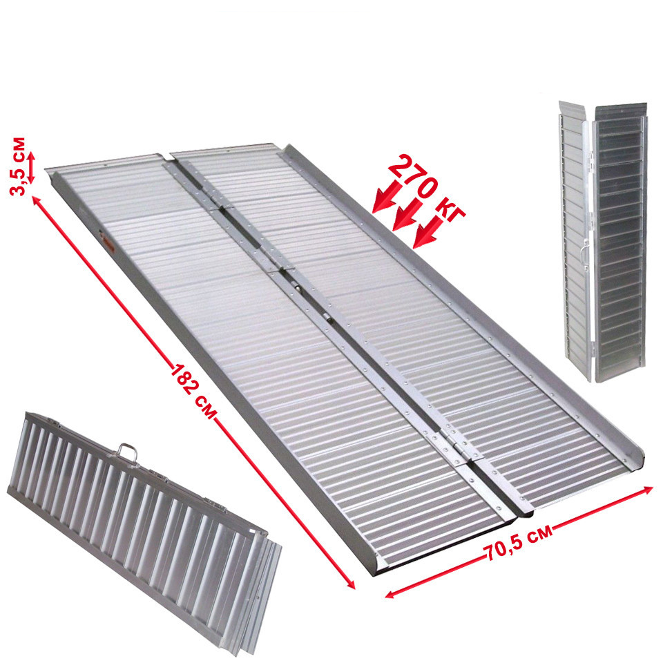 Міцна та стабільна рампа виготовлена з легкого алюмінієвого листа. Вона зручно складається і займає небагато простору при зберіганні. З її допомогою можна зручно та легко завантажувати на височину такі види транспорту, як велосипед, мотоцикл, мопед, скутер, квадроцикл, а також велику техніку тощо. Рампа призначена як для мобільного використання, так і стаціонарної установки. Конструкція дозволяє витримувати об’єкти вагою до 270 кг, а перфорована поверхня забезпечує гарне зчеплення, завдяки чому техніка буде завантажена швидко та безпечно. Додаткову статичність додасть нековзна контрольна пластина. Трап має алюмінієву ручку для зручного транспортування.