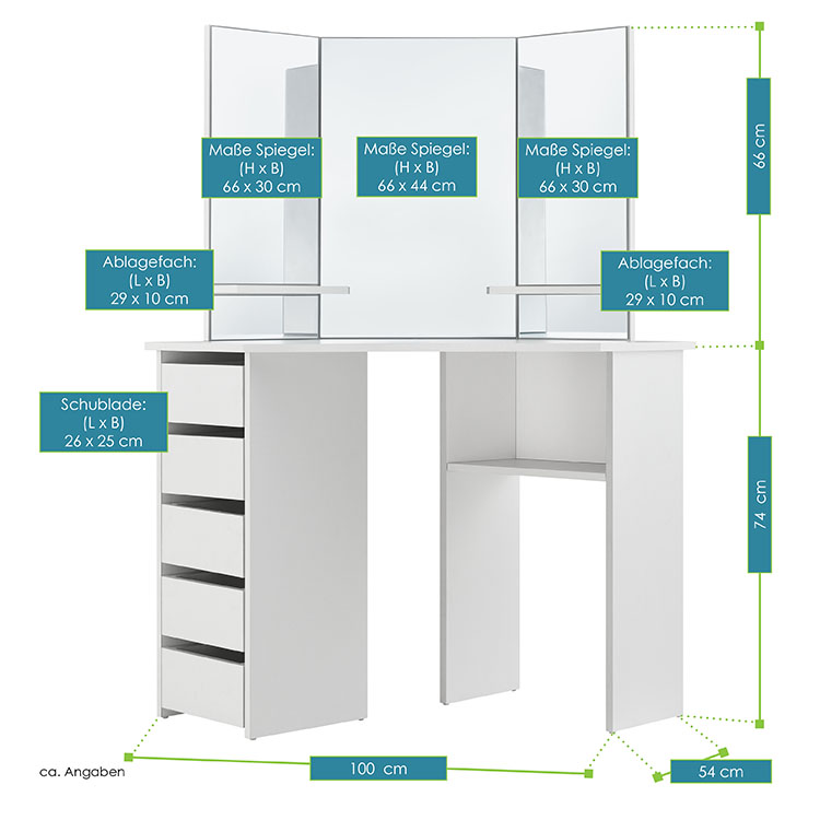 Об’єм поставки: 1 х кутовий туалетний столик з дзеркалом 1 х інструкція